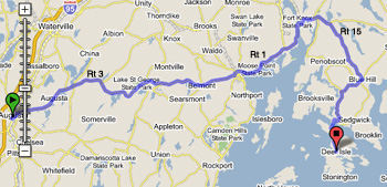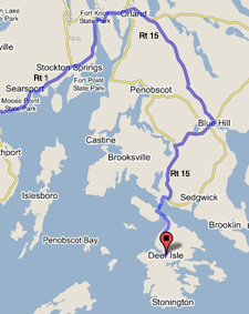 Coming from New England, the fastest route is to take Rt. 295 to Augusta, and then Rt. 3 to Belfast. From Belfast, pick up Rt 1 N to Searsport and Bucksport and then, outside of Bucksport, follow Rt. 15 all the way across the bridge onto the island. We are about 100 mi. from Augusta.